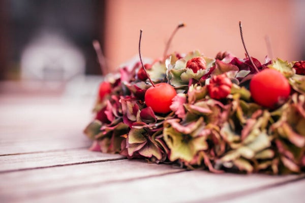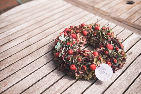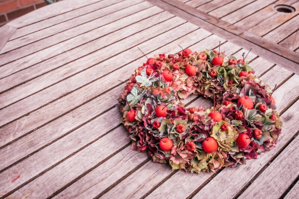 Krans opgemaakt met Hortensia's, sierappels en mini pompoentjes.